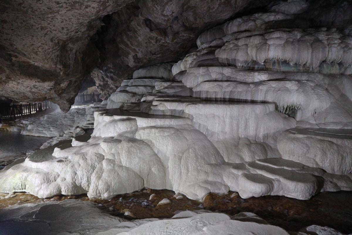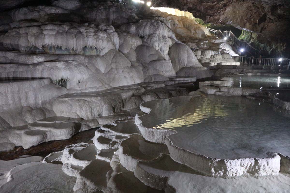 З раннього ранку ми зібрали речі та поїхали до Денізлі на автовокзал. Там ми безкоштовно залишили речі у незнайомого нам чоловіка, який продає якісь квитки і пішли шукати маршрутку, яка нас звозить до Каклика. А звідти треба якось доїхати до підземних травертинів. Водій маршрутки сказав, що повністю вирішить наше питання, якщо не помиляюся за 30 лір за всіх (3,5$). Ми поїхали з ним рейсовою маршруткою. Хвилин через 30 він нас висадив і передав до рук чоловіка машиною. Той нас відвіз прямо до печери і сказав, що за годину й сорок хвилин забере нас прямо звідси. Причому поки що гроші з нас ніхто не брав. За цей час водій маршрутки встигне доїхати до кінцевої зупинки і знову проїжджатиме Каклик у зворотному напрямку, а його друг з машиною нас підсадить прямо у зворотну маршрутку. Схема відпрацювала просто ідеально, але водій маршрутки попросив ще 5 лір (0,6 $) за послуги таксі. Аж не віриться, який лайфхак ми провернули щойно за 4 долари, хоча ще вчора навіть уявити не могли як дістатися цієї печери і повернутися. Тепер про саму печеру. Сказати, що було круто та незвично – нічого не сказати. Я такого дива природи ще не бачив і навіть не знав, що буває підземний Памуккале. Взуття краще залишити на вході.