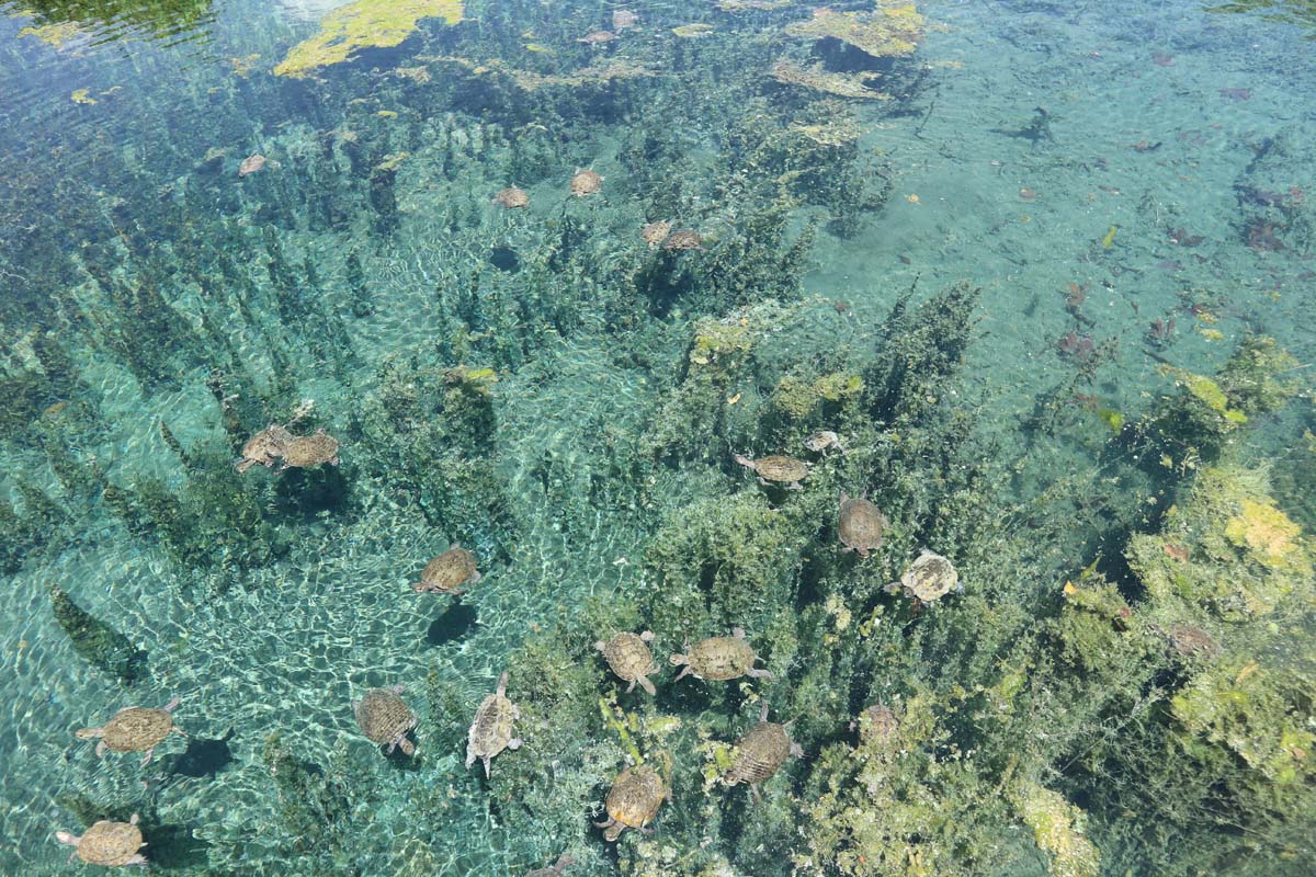 Вода тут на стежках у деяких місцях по щиколотку. А ще тут підземні річки та водоспад. Вау-ефект ми тут зловили на повну. А заразом охолонули від спекотної погоди. На самому початку спуску невелике озерце з кришталево прозорою водою. Звичайно, хвилин 30 вистачило б із головою, але в доковідні часи тут були ще термальні басейни. Зараз же можна помилуватися озером з великою популяцією черепашок, які з голодним поглядом чекають або їжі, або щоб хтось із туристів впав до них.