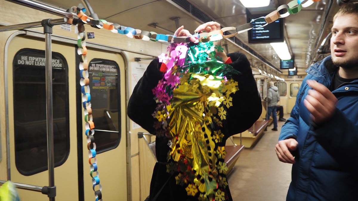 До Нового року 40 хвилин. Ми стоїмо на платформі та аналізуємо поїзди, що проїжджають. Треба було визначити в який поїзд і який вагон сісти, щоб за кількістю народу було затишно. На годиннику 23:41, а значить це наш поїзд! Тут якийсь стрімкий з вигляду мужик, теж проаналізувавши ситуацію, вирішив, що йому треба саме у другий вагон. Нічого, сядемо у протилежній частині. Найближча зупинка була центральною та пересадковою. Переважна більшість з вагону вийшла і сумарно нас залишилося вісім. У нас на все є 15 хвилин, погнали! Першим етапом ми розвішали саморобну гірлянду на поручнях, повісили барвисту зірку.