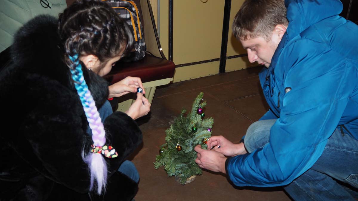 Встановили ялинку, почали її прикрашати! Один із пасажирів пересів ближче до нас. Парочка з сусіднього вагона стежила за нами, ми махали, щоб вони приєдналися, але ті відморозилися.