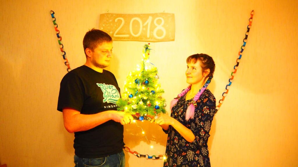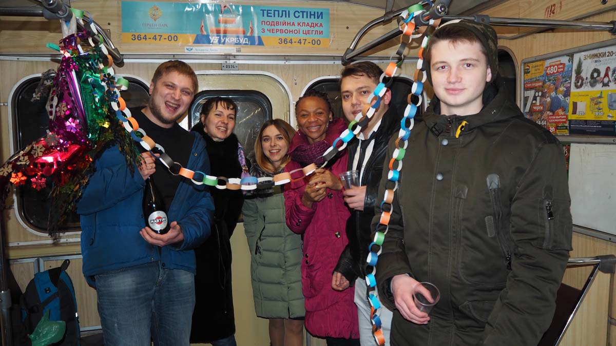 Тепер дістаємо цукерки, мандаринки та новорічну шапку із пророкуваннями. Першим я йшов з цукерками і пригощав пасажирів, навіваючи новорічний настрій. Потім кожен мав витягнути з новорічної шапки у Даші передбачення та взяти в Олі новорічну мандаринку. Таким чином ми підключили всіх у вагоні до нашого святкування. Щоправда, один дідусь відморозився, мабуть, не вірив у щирість задуму. Разом Новий рік ми зустріли всіляко: ми з Дашею, Оля з Женею, дівчина з Нігерії, англомовний хлопець зі Стамбула та хлопець із Києва. Двері зачиняються, наступна зупинка 2018-й рік! Зважаючи на все, з них ніхто не очікував, що відсвяткує новий рік, як належить рівно опівночі з мандаринками та шампанським. 3, 2, 1…. З новим роком!